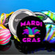 Mostre seu espírito do Mardi Gras com este botão divertido e festivo! Com um chapéu colorido em roxo vibrante, verde e amarelo, é o acessório perfeito para qualquer celebração do Mardi Gras.