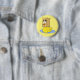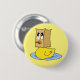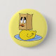 Pobre patinho feio. O botão apresenta um fundo amarelo com um pato amarelo brilhante nadando em água azul e vestindo um saco de papel marrom em sua cabeça.