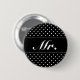 Botão engraçado do pinback do Sr. senhor para o noivo que apenas se casou. Vestir na festa de solteira, no dia do casamento, nas recepções de casamento ou na lua de mel. Design preto e branco elegante do teste padrão de bolinhas. Texto à moda de Personalizable e cor elegante do fundo. Também disponível como a Sra.