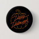Botão do Dia das Bruxas com uma tipografia no estilo de néon do dentro de 'Feliz Halloween' de uma abóbora.