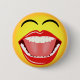 © Sunny Mars Designs Face Pin-Back Buttons - Este botão redondo legal, humorístico, divertido, novidade, crachá ou pino apresenta uma ilustração engraçada de um rosto amarelo risonho emoticon com uma boca grande aberta, dentes claros e brancos, língua e olhos fechados. Conceito de humor.