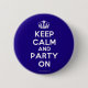 Com base no original Manter Calmo e... poster, este creme e o botão Manter Calmo e Partido Acionado azuis apresentam uma fonte projetada personalizada que corresponde ao original.