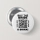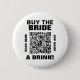 Botão de código QR escaneável da festa de despedida de solteira em branco e preto com a mensagem "compre uma bebida para a noiva" e o nome do aplicativo.