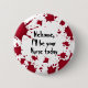 Um botão engraçado para o Dia das Bruxas com sangue e o texto "Bem-vindo, serei sua enfermeira hoje".