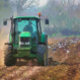 Preparando para a próxima safra. O trator arado (arado) o campo e as aves selvagens procuram comida no solo recém-virado. Watercolor Inglaterra.