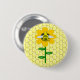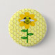 Este botão apresenta uma imagem gráfica de um belo abelhão amarelo com listras, olhos, antenas e pernas pretas. Tem asas bonito, azuis e brancas. A abelha está sentada no meio de um girassol amarelo-ouro. A flor tem um caule verde e três folhas. A mensagem "dia feliz das abelhas" aparece espalhada pelas três folhas. O fundo é composto por um padrão amarelo de mel.