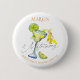 O botão de fim de semana da noiva exibe um vibrante copo de margarita em aquarela e uma fatia de limão à esquerda, capturando perfeitamente o tema "Margs & Matrimony". O design adota um estilo minimalista, com acentos coloridos que equilibram diversão e elegância, refletindo o tom comemorativo do evento.