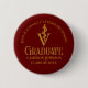 Este moderno botão de festa de formatura da faculdade de medicina veterinária marrom personalizado apresenta o nome do formando da faculdade em um roteiro elegante de ouro para a classe de 2024. Personalize a sua universidade com o veterinário caduceus para obter um presente de graduação em excelente ou nome de etiqueta DVM.
