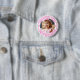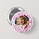 Foto personalizada fofa, botão de aniversário de nome e idade para uma menina, Background tem um confete rosa e roxo. Adicione todas as suas informações e fotos na área de personalização. Que bom para amigos e família vestirem numa festa de aniversário para crianças!