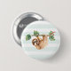 Botão com uma preguiça adorável pendurada de cabeça para baixo de um galho de árvore. Ramo de árvore é decorado com folhas e bagas tropicais. Luz verde-clara e fundo branco.