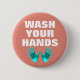 Lave as mãos Botão do Lembrete de Higiene Rosa Azul Teal é perfeito para lembrar aos outros como ajudar a diminuir a disseminação da infecção. O botão é desenhado com um fundo cor-de-rosa de coral pastel e grandes letras brancas em negrito "lave as mãos" e duas pequenas mãos luvas. Você pode personalizar para qualquer cor que desejar. Excelente para os profissionais de saúde e qualquer pessoa que queira apoiar o controlo de infecções.