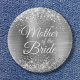 Um botão de vidro feminino para a mãe da noiva. Todo o texto elegante do estilo caligrafia moderno é personalizável. O fundo apresenta uma folha de prata falsa com brilho falso cintilante. Estes elementos digitais são impressão como uma foto.