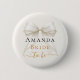Celebre seu marco especial com este botão chique de despedida de solteira. O design apresenta um luxuoso arco de marfim adornado com delicadas contas de pérolas e uma escrita sofisticada com tom dourado. Serve como um acessório elegante para a noiva usar durante o chá de noiva ou à noite com as damas de honra. Cor de fundo marfim.