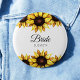 Botões de casamento Sunflower Bride com girassóis amarelos de aquarela floral e texto personalizado em fundo branco. Você pode usar isto para chá de noiva, jantar de ensaio, chá de casal, noivado e recepção. Use a opção personalizar este modelo para alterar o texto | Use a opção personalizar ainda mais para alterar o estilo e a cor do texto, se necessário. Este produto faz parte de uma coleção; portanto, verifique nossa coleção da loja para itens correspondentes.