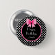 Botão de pino redondo com uma fita rosa em um padrão de bolinhas preto e branco. Para personalizar, digite seu nome no campo modelo.