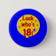 Um balão amarelo, estrelas dos confetes, e texto que lê o "olhar que é 18!" em um fundo azul em em 18os cartões de aniversário, botões, e mais!