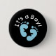 Pegadas do bebê azul em um fundo preto e em um texto branco que leia "é um menino!" em botões do anúncio do bebé.