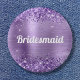 Um botão feminino para as damas de honra na sua festa de casamento. Todo o texto elegante do estilo caligrafia moderno é personalizável. O plano de fundo apresenta uma película púrpura de luz inversa com brilho falso cintilante. Estes elementos digitais são impressão como uma foto.