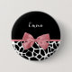 Um botão de impressão de girafa preto e branco com uma fita rosada rosada giratória presa em um arco giro. Personalize este elegante nome de etiqueta de impressão animal adicionando seu nome. Imagem impressa plana, não arco real.