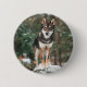 Botão Wolfdog. Lindo foto do Wolfdog Nox, parado em uma rocha, Bois de Vincennes, Paris, França. Foto de Tahoe Beetschen.