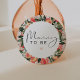 Este pino de botão apresenta pêssegos aquosos e uma letra manuscrita bonita com o ditado "mamãe a ser". Este botão neutro por gênero é o acessório perfeito para o seu chá de fraldas de pêssego ou para a sua festa reveladora.