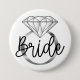 Este botão apresenta as palavras "Noiva" juntamente com um anel de noivado de diamante prateado e branco, o acessório perfeito para a festa de despedida de solteira da Noiva!
