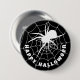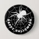 Feliz Halloween, aranha negra e branca rastejando em um crachá de botão de cobweb. O texto é personalizável para que você possa adicionar sua própria mensagem