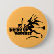Design com o ditado "Beba bruxas" com uma bruxa sobre uma vassoura com um gato e um martini.