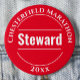 Um crachá para um Event Steward. Altere o texto para seus detalhes. Crachá Steward. Crachá oficial de guarda. Vermelho e branco.