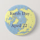 Globo representado em azul claro (oceanos) e amarelo (terra), mostrando linhas de latitude e longitude. Mostre seu apoio aos eventos locais vestindo este botão proclamando "Dia da Terra... O texto de 22 de abril é sobreposto ao gráfico do globo visto do polo norte.