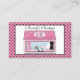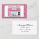 Cartão de visita de moda de varejo com frente de loja e monograma. Design em tema de bolinhas rosa e preto. Adequado para a indústria da moda, lojas, compras em segunda mão e boutiques.
