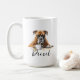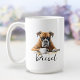 Uma caneca de café matinal com um cão de boxer com nome personalizado no estilo de script. "Que seu Café seja mais forte do que a atitude do seu cão" está escrito nas costas. Presente perfeito para donos de cães que têm um cachorro com atitude e também adoram café.