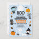 convite de aniversário de Halloween de garotos bonitos com várias personagens bonitas de Halloween em cinzas, pretas e laranja. Este design é ideal para marcar a cena da festa de aniversário de Halloween.