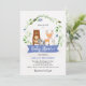 À procura de um belo convite de chá de fraldas de bichos de madeira com um toque de azul quente? Este design ideal para o chá de fraldas de um menino apresenta quatro lindos animais de floresta em um plano de fundo de imagem de papel a aquarela digitalizado. A parte de trás do convite é um padrão de diafragma de lavagem com aquarela. O convite para chá de fraldas de animais florestais deste rapaz está pronto para você se personalizar. Esta design pode também ser utilizada noutras ocasiões, uma vez que todo o texto é editável.