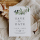 Este moderno ramo de oliveira, salvo o cartão de data é perfeito para um casamento de boho. O design rústico, porém elegante, apresenta folhas botânicas de cor aquática simples e azeitonas pretas num pequeno galho com um toque mediterrânico clássico.