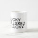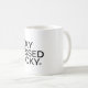 Branco básico 11 onças. Caneca de café com nossos logotipo e slogan nele
