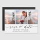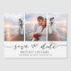 Escolha as melhores fotos de sua filmagem de noivado ou suas fotos favoritas de vocês duas para esta data perfeita, salve a data. As palavras salvar a data são manuscritas para dar um toque pessoal ao cartão. A parte frontal tem 3 imagens e a parte traseira tem uma imagem grande com um filtro branco na parte superior.