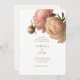 Moderno e moderno com o sentimento clássico. Este adorável convite de casamento apresenta um buquê de sotaques volutuosos de rosa contra fundo branco e marfim. O conjunto de fontes contemporâneas no verde-oliva exude uma elegância na moda moderna. Na parte de trás estão os detalhes do site de casamento do casal e o aviso para RSVP.