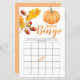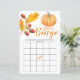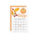 Um Bridal Bingo Fall Pumpkin Game é uma atividade festiva e divertida concebida para um chá de panela com um tema de outono. Em vez dos números clássicos do bingo, as cartas são decoradas com motivos sazonais — abóboras, folhas de outono, bolotas e flores rústicas em tons quentes de laranja, ouro, burlôncio e sábio. Cada quadrado no cartão de bingo é cheio de presentes comuns de chá de panela ou artigos relacionados ao casamento, como "óculos de vinho", "velas", "utensílios de cozinha" ou "lua de mel". Os convidados marcam os quadrados à medida que a noiva abre seus presentes, visando completar uma fileira ou padrão como no bingo tradicional. O tema da abóbora adiciona um toque acolhedor e caprichoso — as cartas podem apresentar ilustrações da abóbora nos cantos, ou o "espaço livre" central pode ter a forma de uma abóbora. O design geralmente equilibra elegância com encanto sazonal, fazer que se sinta festivo sem ser excessivamente casual.