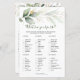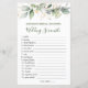 Este design apresenta a ilustração aquarela da folhagem verde e dourada com o efeito do ouro confetti. Jogos de Chá de panela verde - Cartão duplo - Dois jogos em um! Bridal What's in your Purse Game na frente da carta e do jogo Wedding Scramble no sentido inverso. A chave da resposta para o jogo de Casamento: Noiva, Groom, Bolo Casado, Lua de Honra, Amor Verdadeiro, Vestido Branco, Lace, Felicidade, Vela de Unidade, Padrinhos de casamento, Oficiente, Capela, Voos Casamentos, Brincadeira.