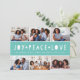 Compartilhe seis fotos favoritas com o nosso cartão festivo e brilhante. Um vibrante centro aqua lê "alegria, paz, amor" em letras brancas de recorte com seus nomes e no ano abaixo.