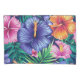 A bold, maximalist tropical floral print with big purple, orange, and pink blooms on a dark blue background,
