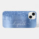 Capas de iphone elegante e giro personalizada com brilho azul esmaecido sobre fundo metálico azul esfregado. Personalize com seu nome em um roteiro branco de tendência de na moda com baloiços.