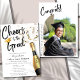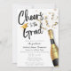 Brinde ao Anúncio de Festa de Formatura com Brindes de Champanhe - Um anúncio de convite de festa de formatura personalizado moderno e único. Apresenta uma garrafa de champanhe festiva com confetes. A frase "Brinde ao Formado" é escrita em tipografia de letra pincel. Edite este modelo de convite de formatura de faculdade ou universidade com os detalhes do seu evento. No verso, adicione a foto do seu graduado à moldura do arco. Também disponível como download digital instantâneo, perfeito para enviar via mensagem de texto, e-mail ou mídia social.