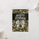 Cartão de aniversário personalizado com "Parabéns" em tipografia mista, arco prateado, fita de satin e fundo de camuflagem castanha.