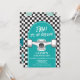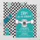 Bruh é meu aniversário! Convite de aniversário de skate com cheque preto e skate azul.