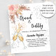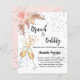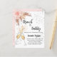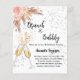 Um convite moderno, na moda e glamouroso para um Chá de panela de bolinho. Um fundo branco com bolhas, um par de flautas, óculos, rosas cor-de-rosa pinceladas e grama-pampas. O nome é escrito com um moderno estilo escrito à mão. Personalize e adicione os detalhes da sua festa. 1 folha = 1 convite impresso de borda a borda