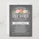 Este convite para Chás de fraldas apresenta lindas flores aquáticas e uma mistura de tipografia moderna, tudo sobre um fundo de chalkboard moderno. Envie seus convidados e eles não esquecerão! Para um convite ainda mais memorável, selecione uma forma recortada, um papel texturizado ou um papel ultra espesso. Itens correspondentes disponíveis. Alterações de Design disponíveis mediante pedido.