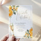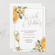Convite Brunch de casamento com uma flauta de champanhe dourada, estrutura de ouro e laranjas com flores de laranja.Personalize com suas informações para as recém-casadas.