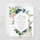 Convide seus hóspedes de brunch em estilo com este elegante convite floral de orçamento personalizado com rosas pintados à mão de azul marinho e cor-de-água rosa pincelada com verde. Personalize com todos os seus detalhes de brunch-bridal na tipografia negra da escrita negra. A parte traseira da placa tem um padrão floral de rosa correspondente. Desenhada por Susan Coffey.